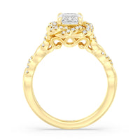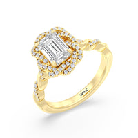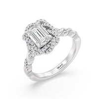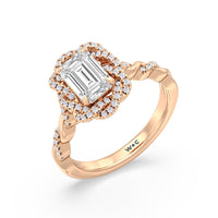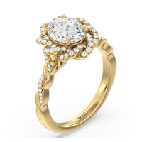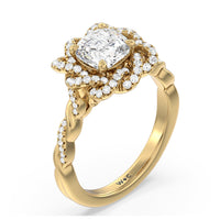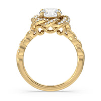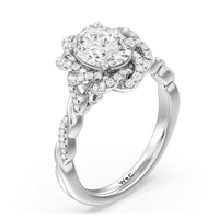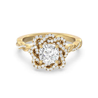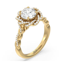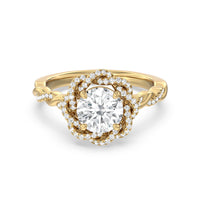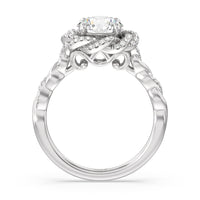 This vintage-style halo engagement ring showcases a dazzling center stone in a classic claw-prong setting amidst the beautifully arranged petals of its floral-look halo for a captivating floral appeal. A twisted halo design enhances its elegance, while soft ribbon detailing intertwines with pave diamonds along the band, resembling a twisted, vine-like shank. The intricate scrollwork in the gallery mirrors a vintage carriage-like basket, adding to its timeless charm. A perfect floral engagement ring for women who adore vintage-inspired romance.
