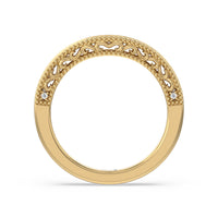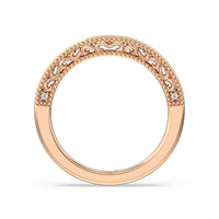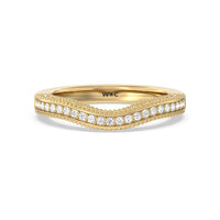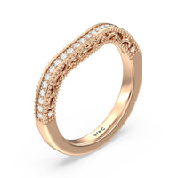 This curved diamond set wedding band is perfectly contoured to complement our vintage grapevine scroll 3 stone diamond engagement ring for a simple and sophisticated look.