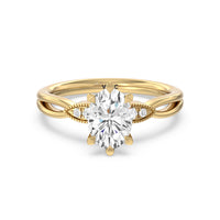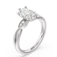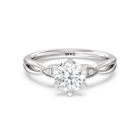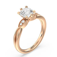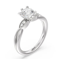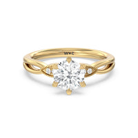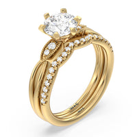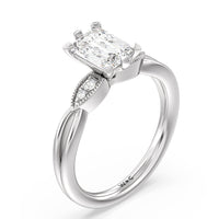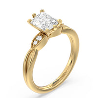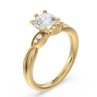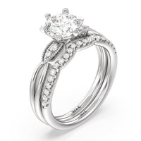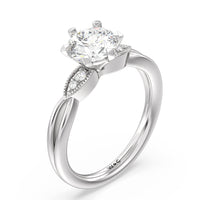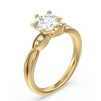 Channeling timeless elegance is this vintage-inspired diamond engagement ring. It features a center diamond held by six prongs and flanked by side stones embellished with milgrain beading. Grooves appear just before the split for a shapely shank that makes a statement.