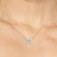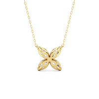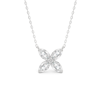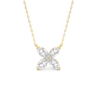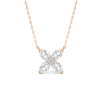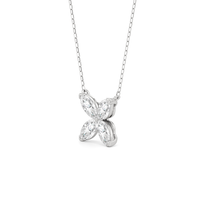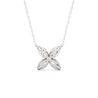 The Wildflower Necklace captures a blend of mystery, simplicity, and sophistication. It presents four marquise diamonds chosen for their radiance and superlative quality, forming the shape of a delicate bluet. The elongated silhouette of each marquise diamond gracefully reflects and refracts light, creating a bold brilliance.