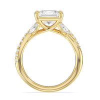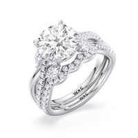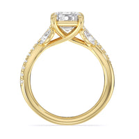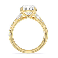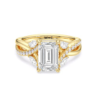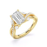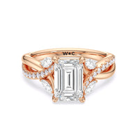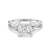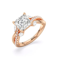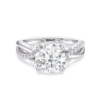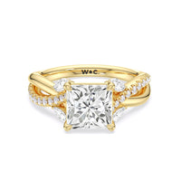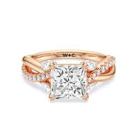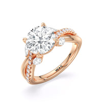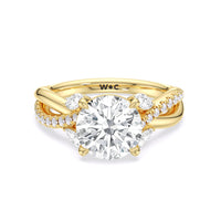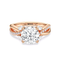 This diamond engagement ring features a unique vine-inspired band that evokes the enduring nature of love. The splitting and twining shoulders of the ring represent love that remains, carries on, and grows amidst life's twists and turns. Poised at the center of the band's diamond-trailed, criss-cross shoulders is a gorgeous diamond center stone.